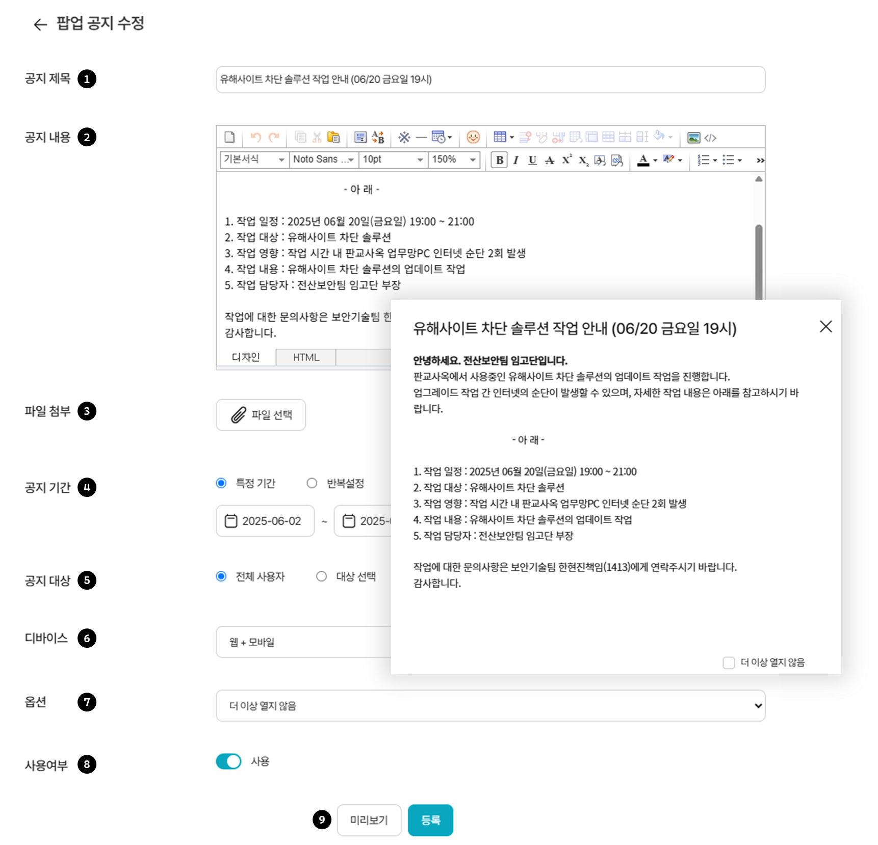 - 공지 기간 : 특정 기간 동안 공지를 노출하거나 반복 설정