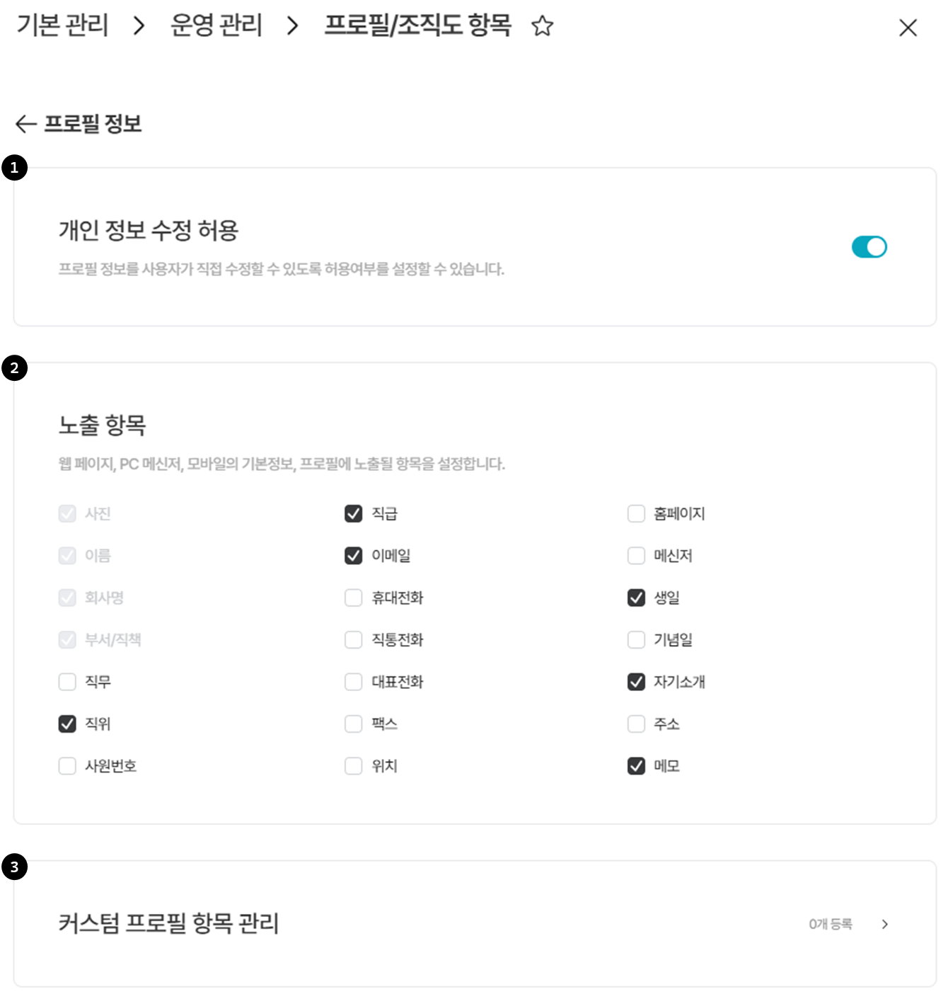 프로필 노출 항목 : 웹 페이지, PC 메신저, 모바일 등에서 기본 정보와 함께 프로필에 노출될 항목 설정