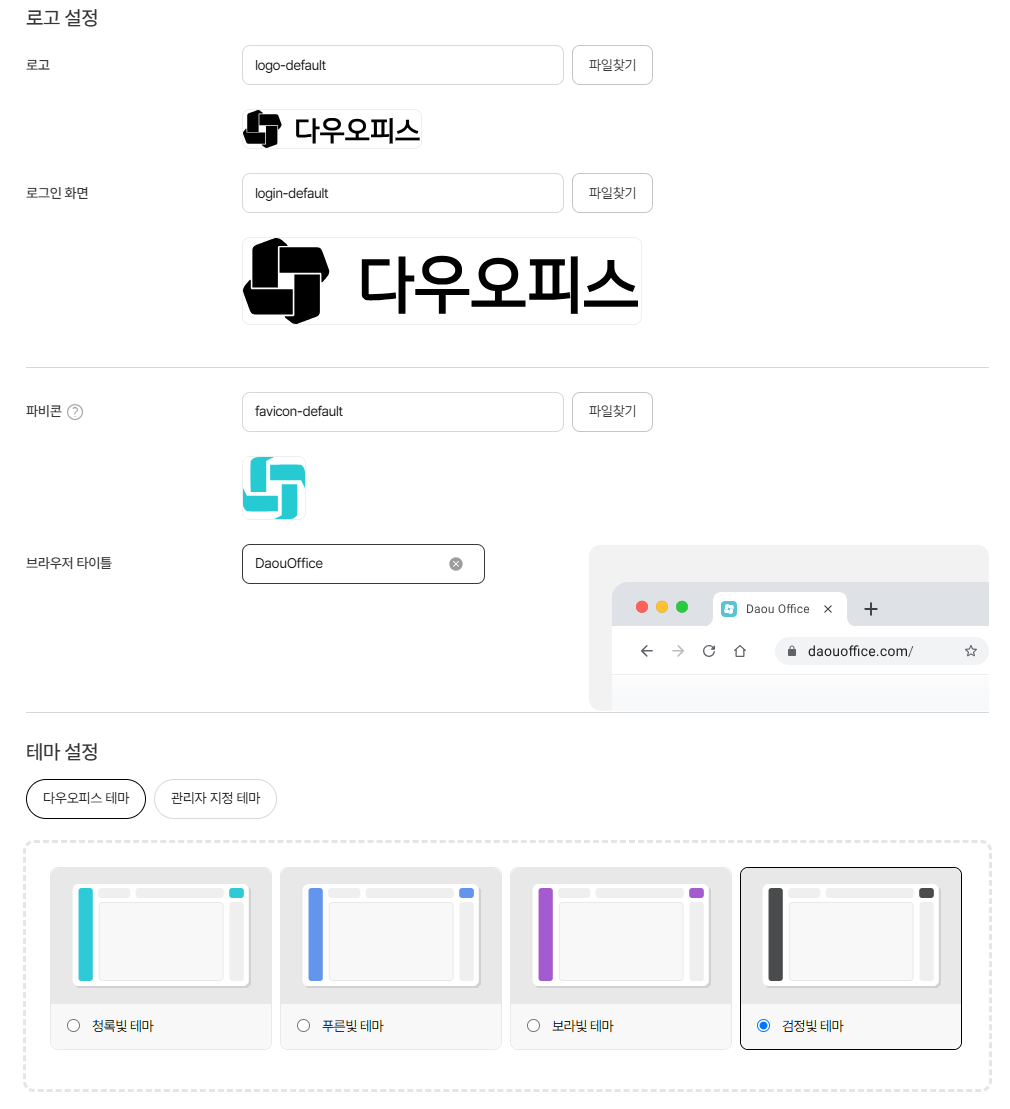🧭 다우오피스 오른쪽 상단 통합설정⚙️ > 기본관리 > 운영 관리 > [로고 및 테마] 는 회사의 아이덴티티를 반영할 수 있도록 다양한 시각적 요소를 커스터마이징 할 수 있는 기능입니다.