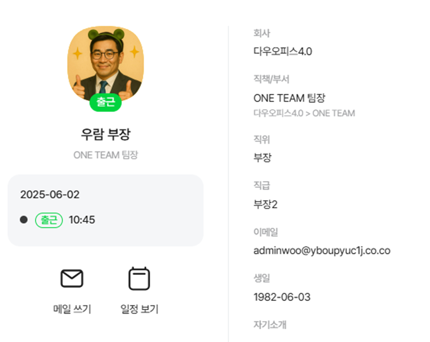 🧭 다우오피스 오른쪽 상단 통합설정⚙️ > 기본관리 > 운영 관리 > [프로필/조직도 항목]은 사용자 프로필 정보를 관리하고, 이를 바탕으로 조직도에 추가 정보를 표시할 수 있는 기능입니다.