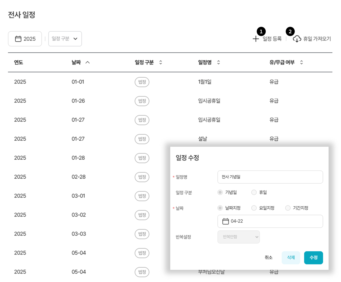 - 일정 구분 : 기념일, 법정 휴일, 약정 휴일 등으로 분류하여 관리