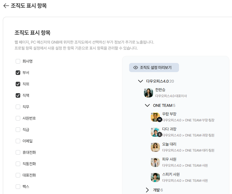 - 조직도에서 노출할 항목을 선택하여 정보 공개 범위 조정