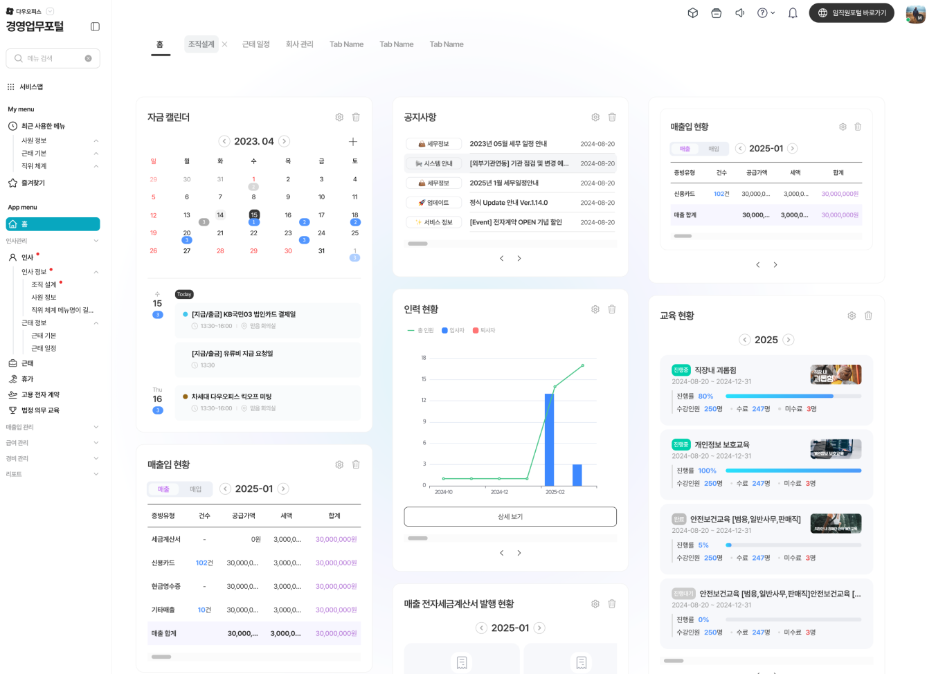 대시보드는 경영업무 포털에 접속하면 가장 먼저 보이는 화면으로, 여러 개의 가젯으로 구성됩니다.
