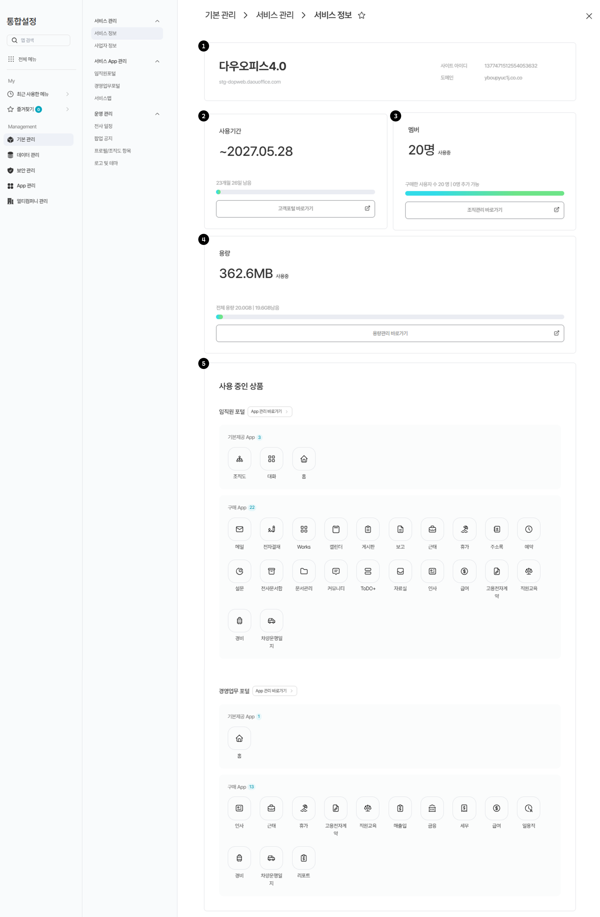 🧭 다우오피스 오른쪽 상단 통합설정⚙️ > [기본관리] 의 서비스 관리는 조직이 이용 중인 서비스의 정보를 확인하고, 운영에 필요한 사항을 관리하는 기능입니다.