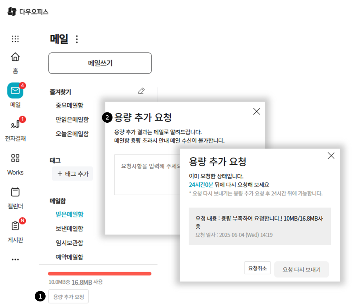 - 메일, 자료실, 드라이브 용량 추가 요청 레이어는 동일함
