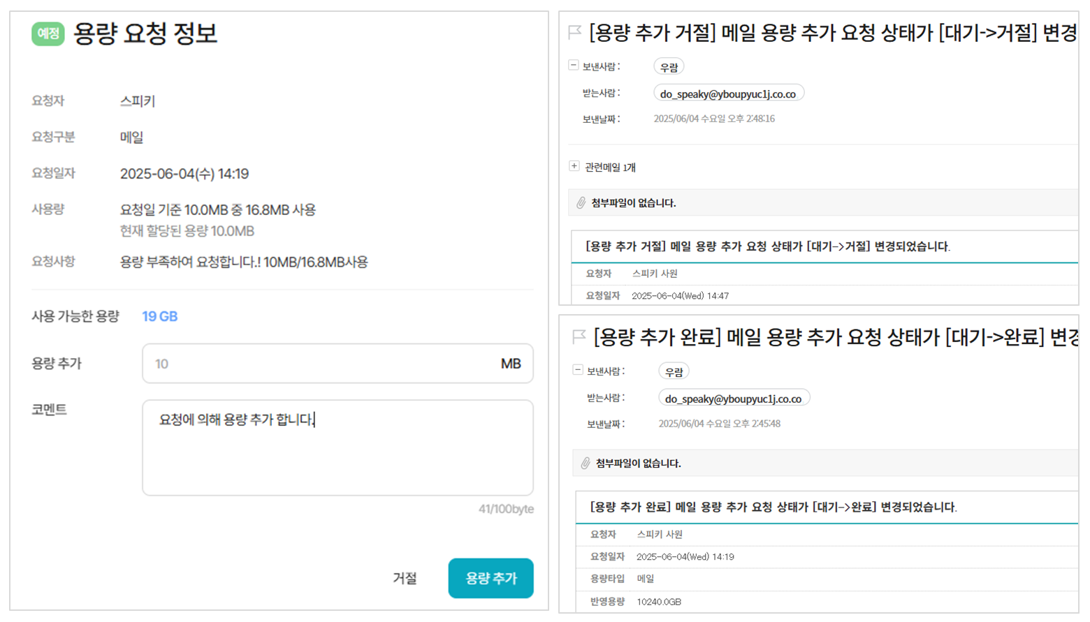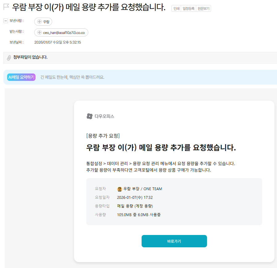 예) - 메일의 [바로가기] 버튼 또는 🧭통합설정⚙️ > 데이터 관리 > 용량 관리 > 용량 요청 관리 > [용량 요청 내역] 에서 직접 요청 사항 확인