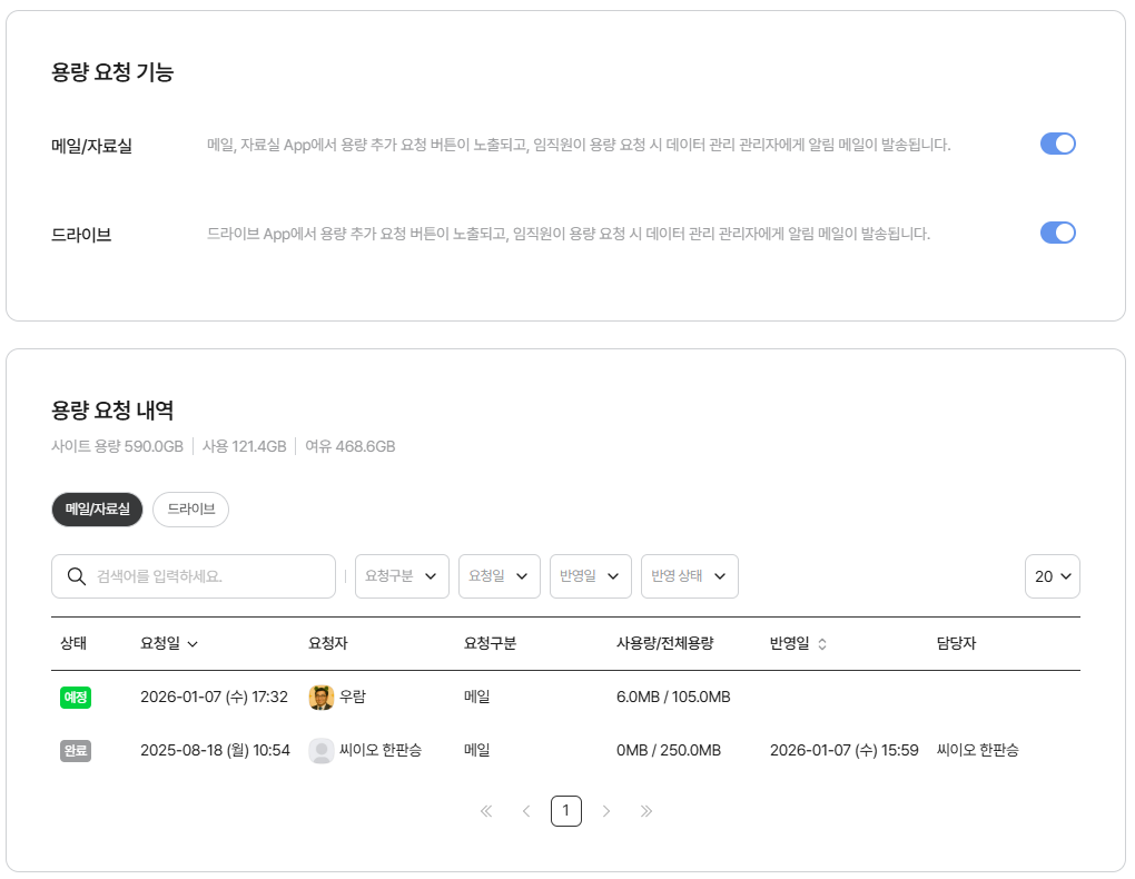 🧭통합설정⚙️ > 데이터 관리 > 용량 관리 > [용량 요청 관리]는 용량이 부족한 사용자가 관리자를 직접 찾을 필요 없이, 간편하게 용량 추가 요청을 할 수 있도록 지원하는 기능입니다.
