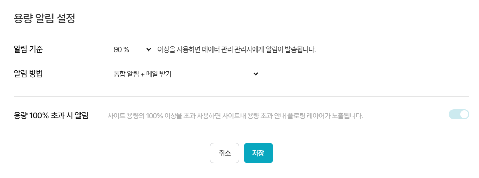 🧭통합설정⚙️ > 데이터 관리 > 용량 관리 > [용량 알림 설정]은 구매한 전체 용량의 사용량이 일정 수준에 도달했을 때 데이터 관리 관리자에게 알림을 발송하는 기능입니다. 이를 통해 용량 부족 문제를 사전에 인지하고, 필요 시 용량 추가 구매 등의 조치를 취할 수 있습니다.