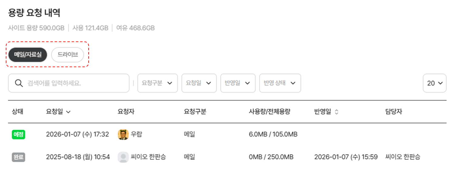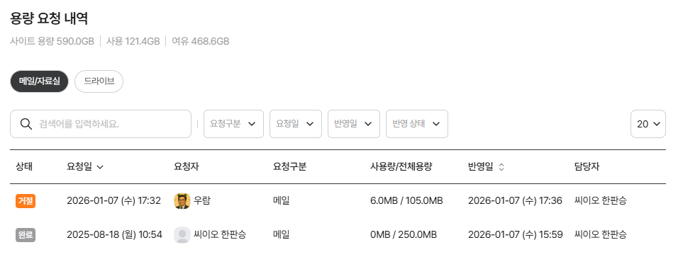 - [용량 요청 내역]은 메일/자료실 탭과 드라이브 탭에서 각 확인 가능