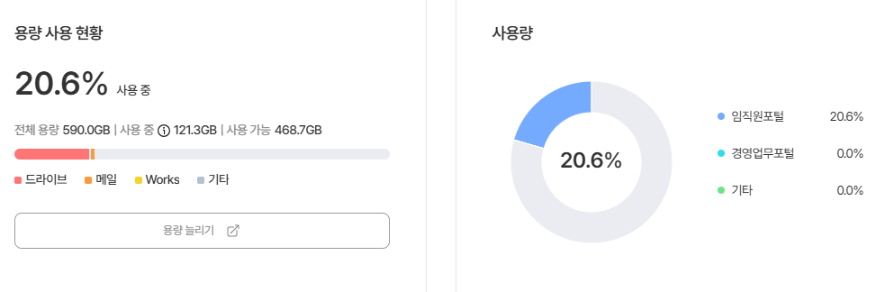 - 전체 용량 : 사용 중 용량 (메일/개인 자료실 외 모든 앱 사용량 합 + 메일/개인 자료실 할당 용량)
