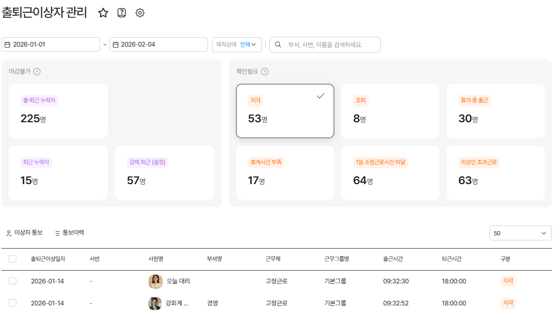 - 근태 이상 상태(누락, 지각, 초과근로 등) 직원 확인