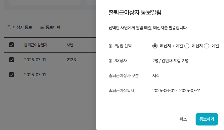 - [이상자 통보] 클릭 > 메시지 확인 후 [통보하기]