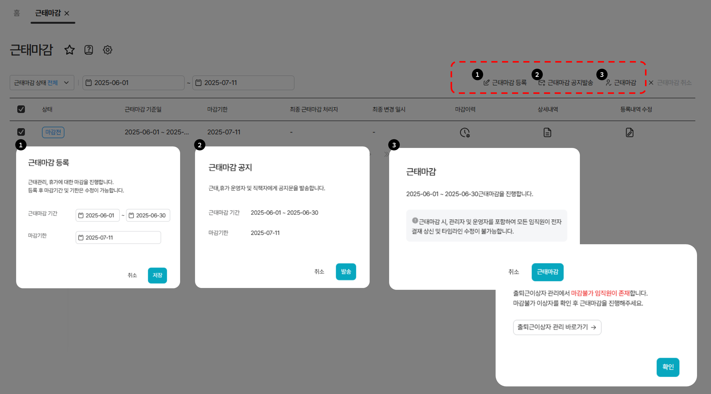 마감 이후에는 모든 근태기록 수정이 불가능하므로, 사전 점검이 중요합니다.