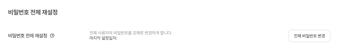- 비밀번호 전체 재 설정 : 전체 사용자의 비밀번호를 강제로 변경. 마지막 설정일자 노출