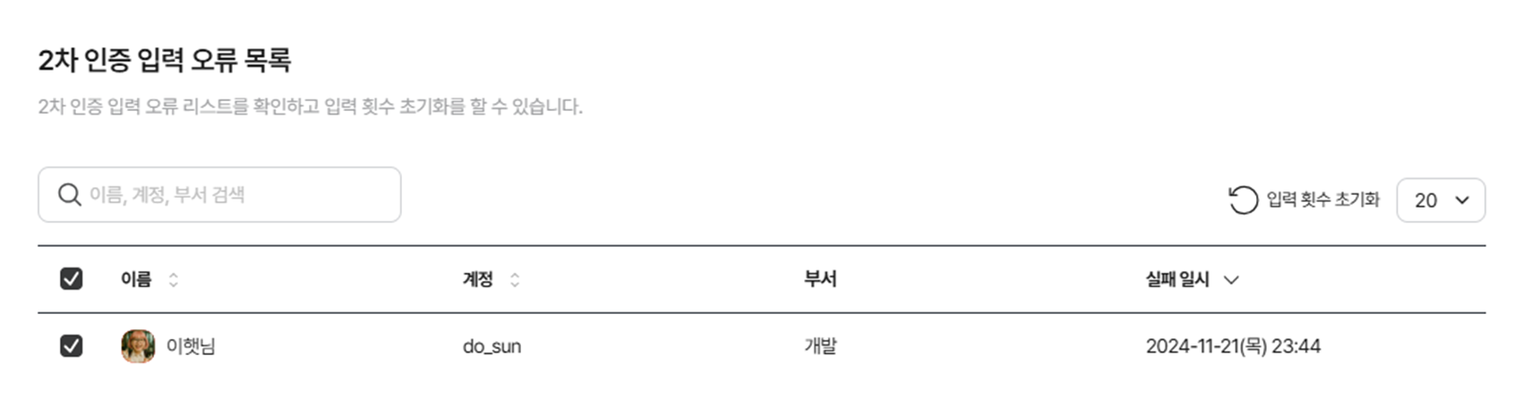 사용자가 2차 인증을 입력하는 과정에서 5회 오류가 발생할 경우, 이를 관리하고 초기화할 수 있습니다.
