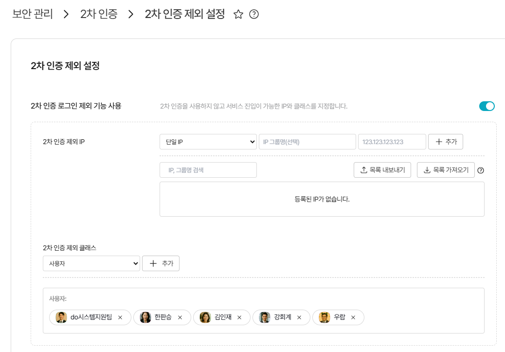 🧭통합설정⚙️ > 보안 관리 > 2차 인증 > [2차 인증 제외 설정]에서는 2차 인증을 제외할 수 있도록 설정할 수 있습니다. 하지만 반드시 주의하시기 바랍니다!