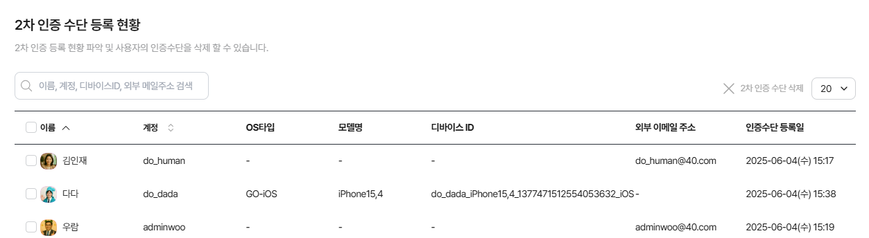 - 사용자별 이름, 계정을 기본으로 메일OTP/이메일 인증 수단에 따라 OS 유형, 디바이스 ID, 이메일 주소, 인증수단 등록일 확인 가능