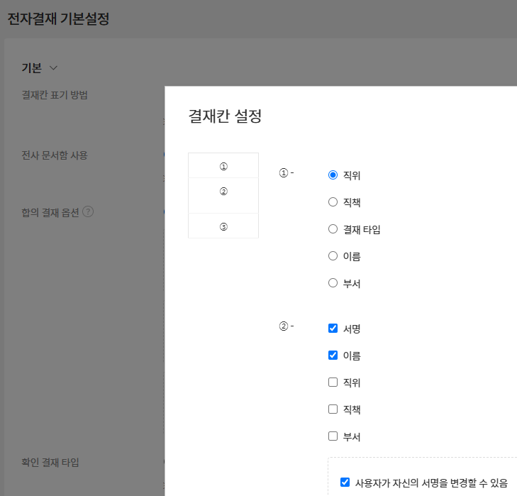 🧭임직원 포털 > 전자결재 > 전자결재 환경설정에서 [서명 올리기] 버튼은 🧭통합설정 > App관리 > 임직원 포털 > 전자결재 > 전자결재 기본설정 > [결재칸 설정]에서
