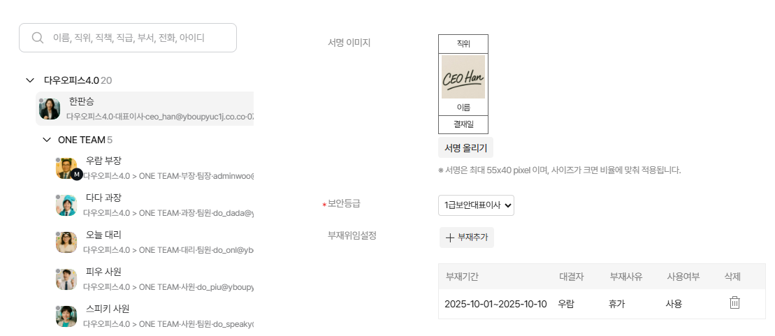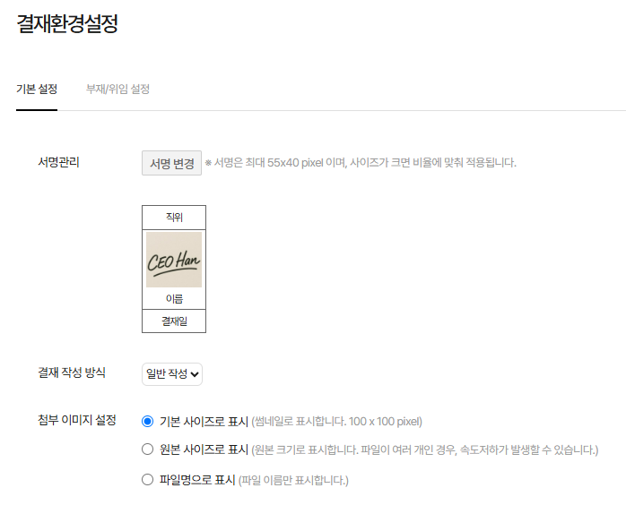 서명 이미지 : 결재 시 사용할 서명을 관리자가 멤버별로 등록