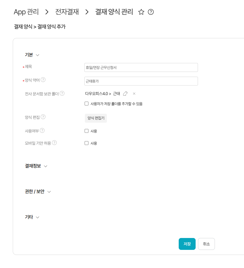 - 모바일 기안 허용 : 모바일 앱에서 기안 작성 여부 설정
