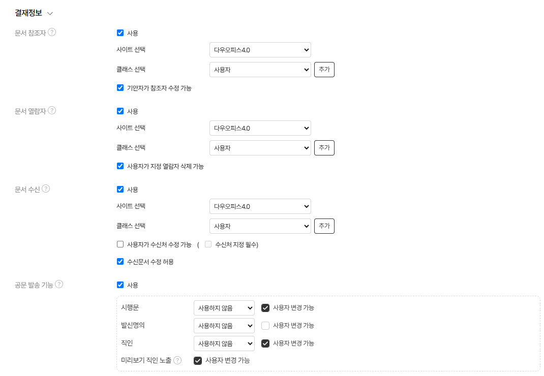결재 문서의 참조, 열람, 수신, 공문 발송과 관련된 기능을 설정하는 영역입니다.