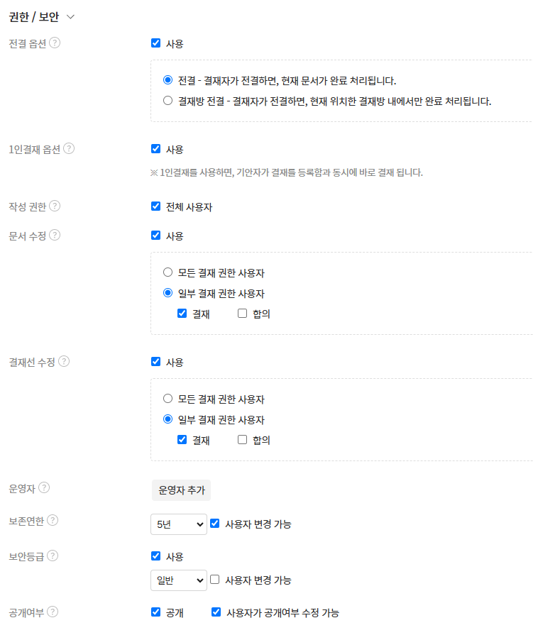 전자결재에서 문서의 결재 권한과 보안 정책을 설정하는 기능을 제공합니다. 문서 전결 및 1인결재 방식, 작성 및 수정 권한, 운영자 지정, 보존 연한, 보안 등급, 공개 여부 등을 세부적으로 관리할 수 있습니다