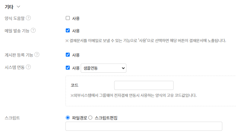 스크립트 : 전자결재 문서와 관련된 스크립트를 설정 및 편집 가능
