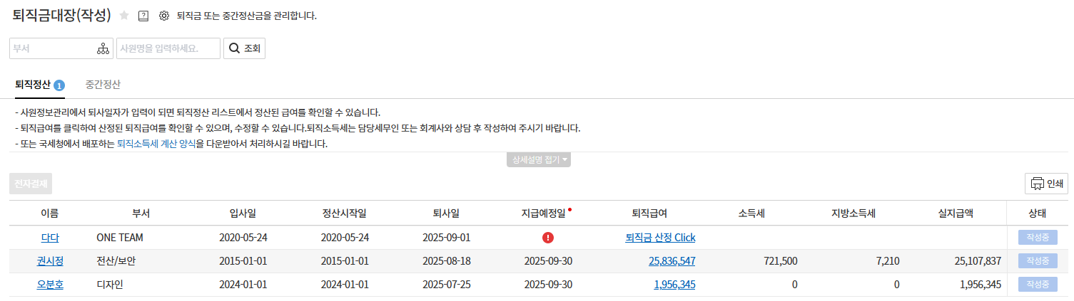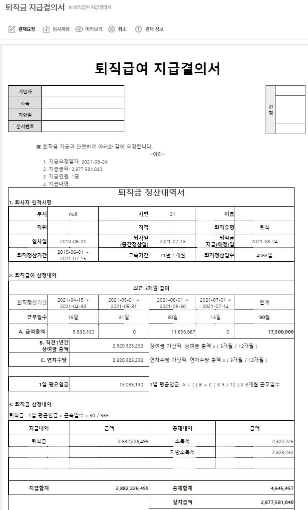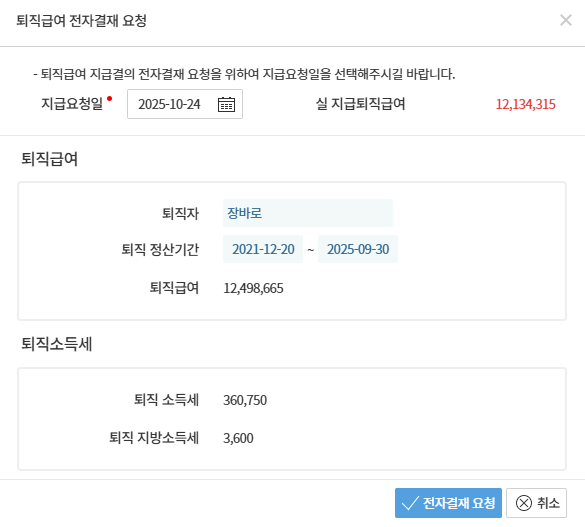 정식 퇴사자가 발생한 경우, 퇴직금 지급을 위한 정산 금액을 계산하고 전자결재를 통해 확정 및 지급합니다.