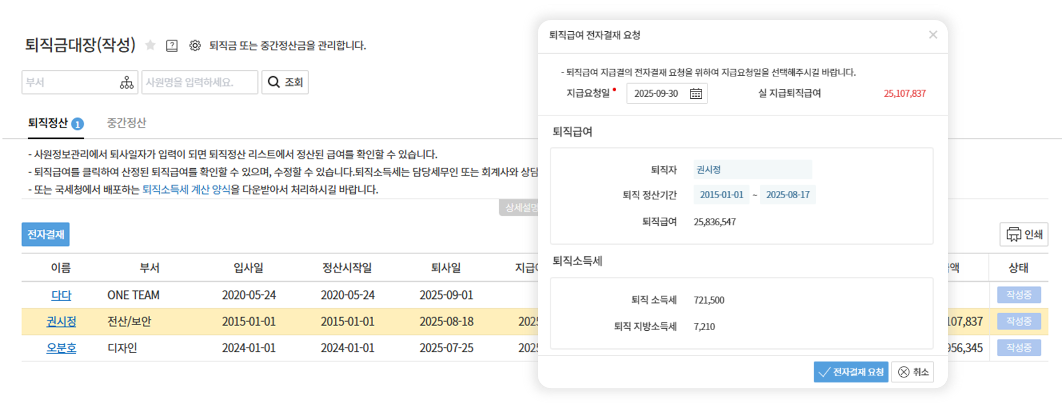 - 정산된 퇴직금 및 중간 정산금 지급 결재 가능