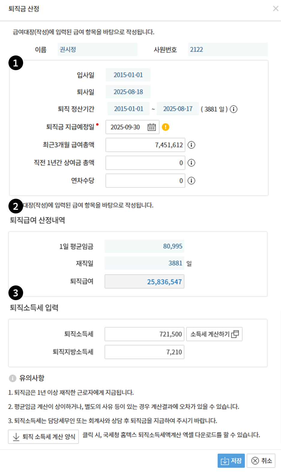 - 최근 3개월 급여 총액 : 퇴사일 기준으로 최근 3개월 급여대장(작성) 메뉴에 입력된 급여의 지급총액 합계가 반영 됨을 안내