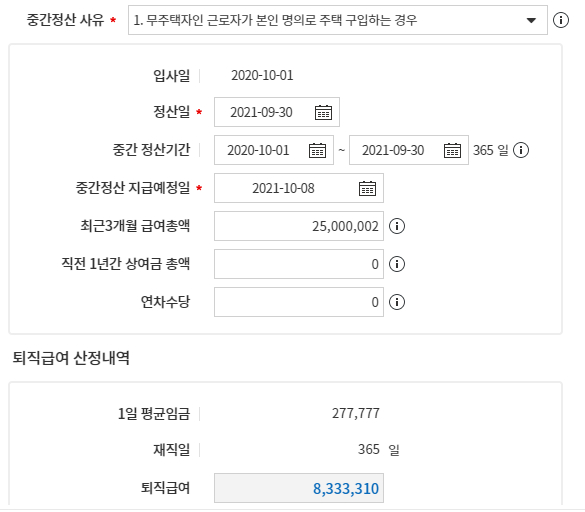 - 중간 정산기간 : 퇴직금 중간 정산을 위한 기간이며 입사일 부터 위에서 설정한 '정산일'