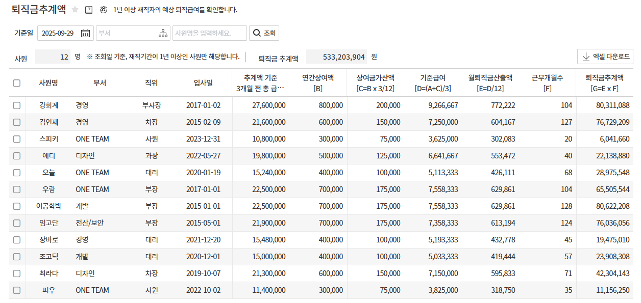 - 엑셀 다운로드 : 조회된 근로자들의 퇴직금 정보를 엑셀 형식으로 다운로드