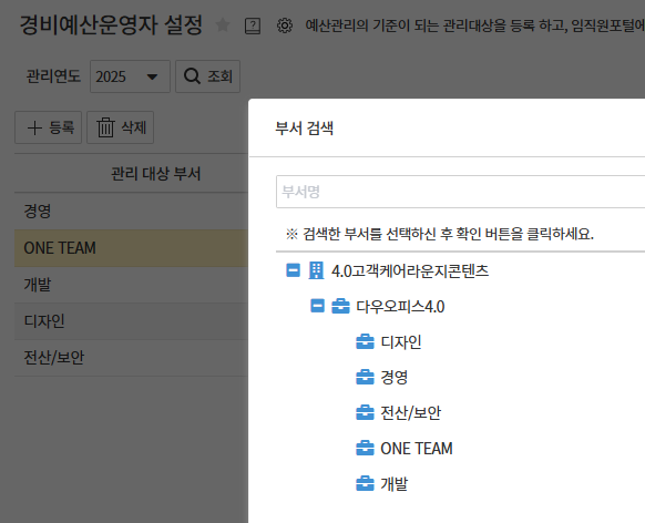 - 관리대상 등록/삭제 : 예산 편성의 기준이 되는 부서를 관리대상으로 등록/삭제