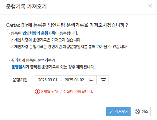 차량운행일지 우측 상단의 [운행기록 가져오기] 버튼 선택으로 운행기록을 CartaxBiz에서 가져옵니다.