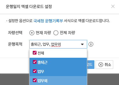 국세청 운행기록부 서식 기준으로 선택한 차량 기준 또는 전체 차량에 대해 다운로드 됩니다.