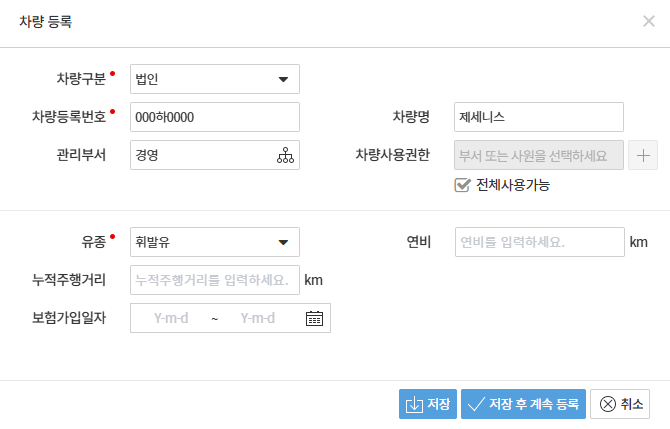 3. 차량명 : 차종 또는 내부 명칭 입력 (예: 제네시스, 임원1호 등)