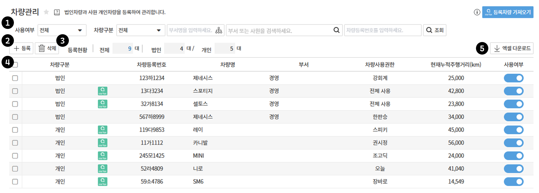 5. 엑셀다운로드 : 등록되어 있는 차량목록을 엑셀로 다운로드