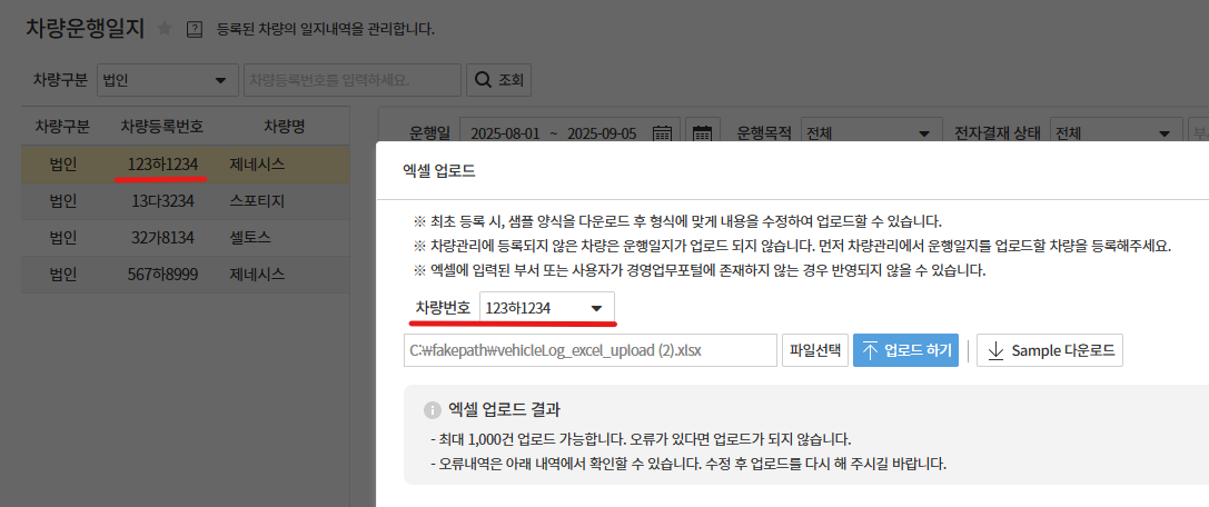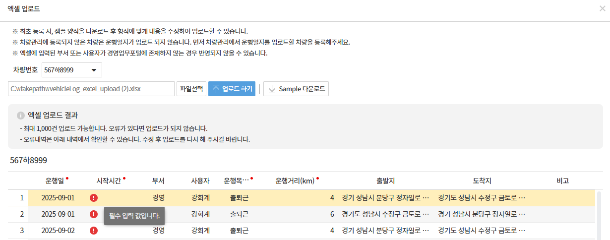차량운행일지 엑셀 업로드 결과