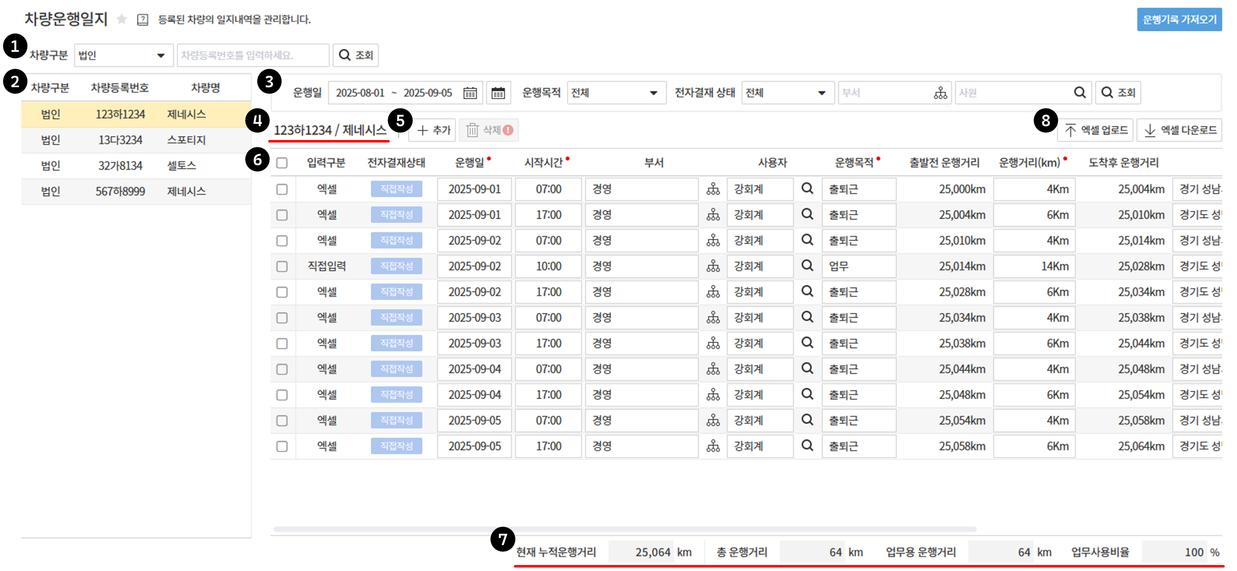 7. 주행거리 : 선택한 차량의 총운행거리 및 업무용운행거리와 업무사용비율 확인