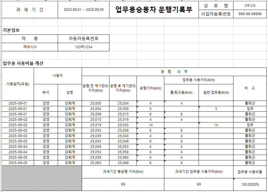 • 국세청 신고 서식에 맞춘 운행일지 엑셀 다운로드 가능