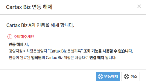 - 관리자가 연동을 해제하면 Cartax Biz로부터 운행 기록 데이터가 더 이상 자동으로 수집되지 않음