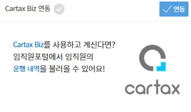- 경영업무 포털(관리자용) : 최초 1회 연동 설정이 필수이며, 완료 후 Cartax Biz에 등록된 법인/개인 차량 정보 및 운행기록을 불러오기 가능