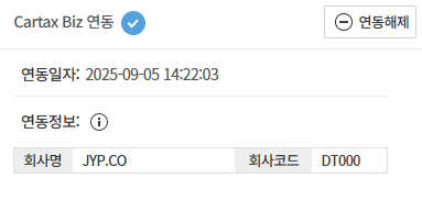 Cartax Biz와의 연동을 중단하고 싶을 경우, [경영업무 포털] > 상단 [외부기관연동센터] > [기간별 연동설정] [Cartax Biz 연동]에서 [연동해제]를 선택합니다.