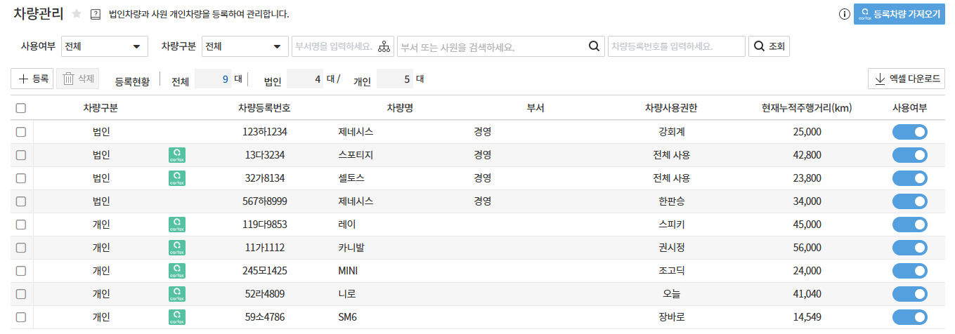 - [➕등록]으로 수기로 법인/개인 차량 등록 가능
