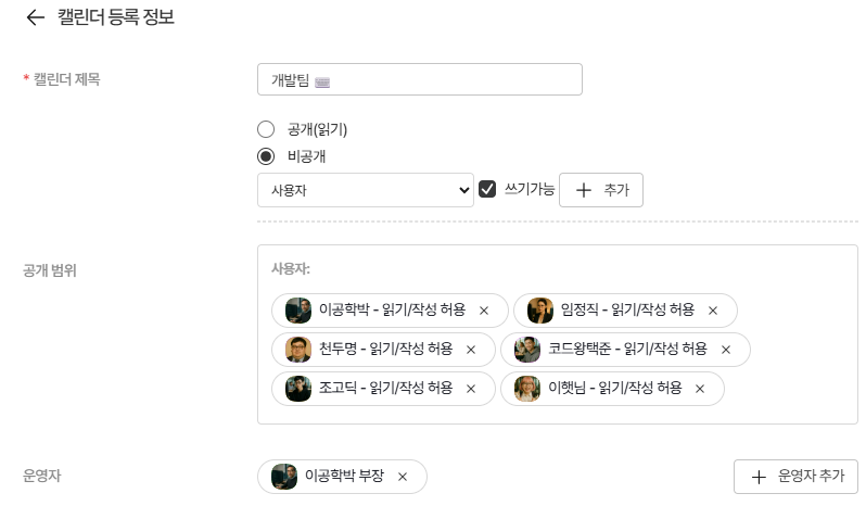 - 운영자 : 해당 캘린더에 일정 등록 및 관리 권한 부여