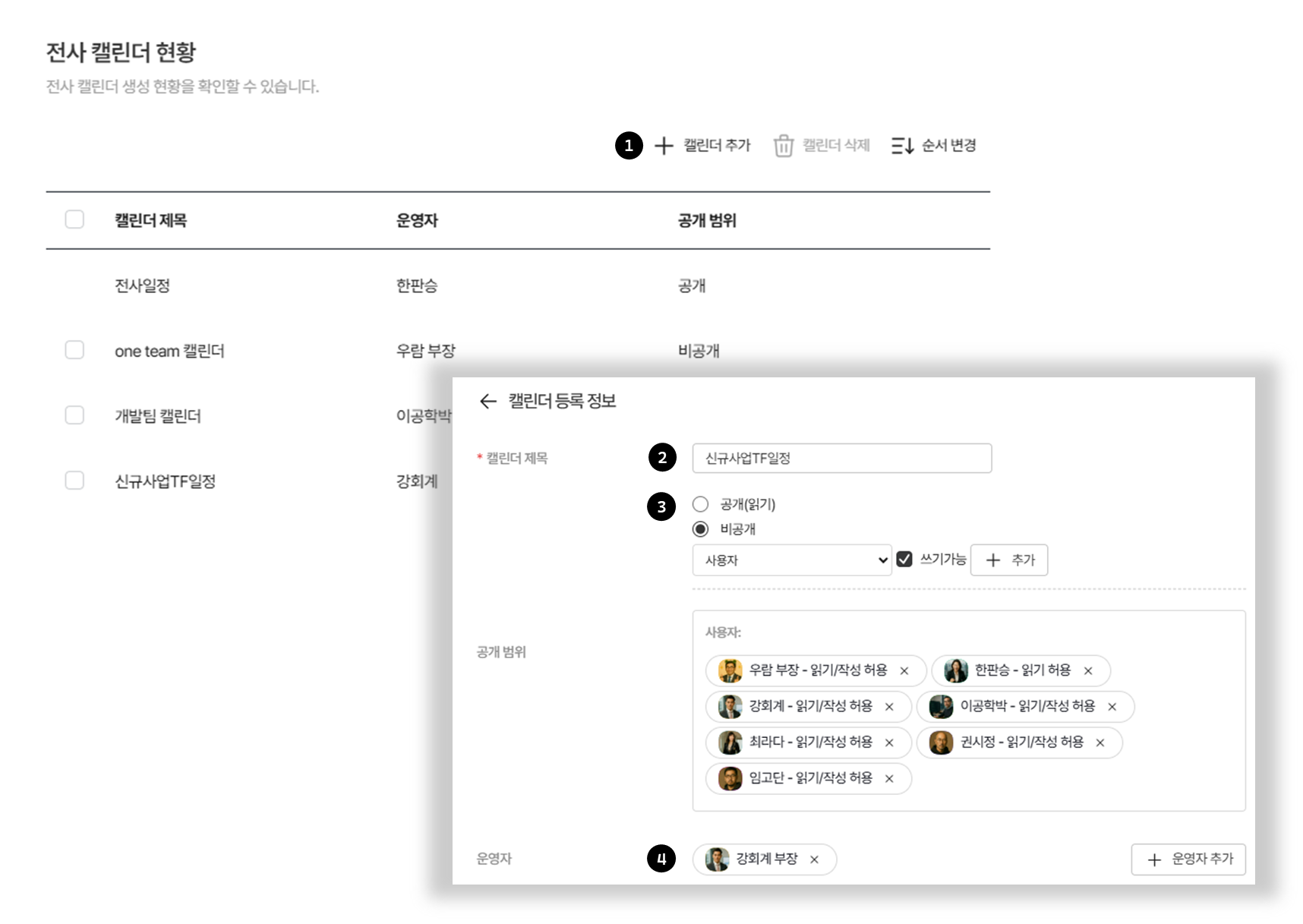 - 캘린더별 운영자 지정 및 권한 관리가 가능