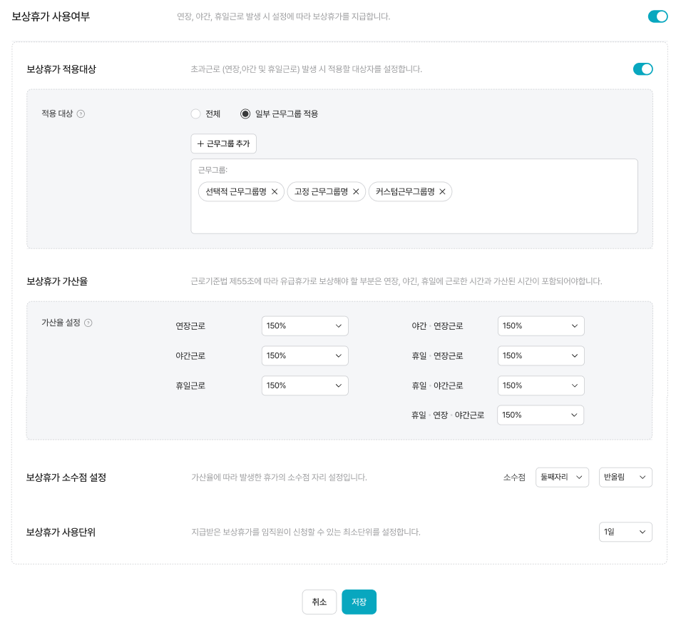 - 보상휴가 가산율 : 유급휴가로 보상할 연장, 야간, 휴일 근로 시간 가산율 설정