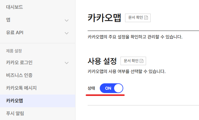 카카오맵 API 활성화를 위해 제품 설정 > [카카오맵] 에서 카카오맵 사용 설정 상태를 ON으로 변경합니다.