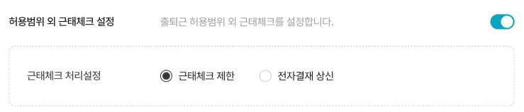 임직원이 출퇴근 허용범위 외 장소에서 근태체크를 시도할 경우, 처리 방식을 선택할 수 있습니다.