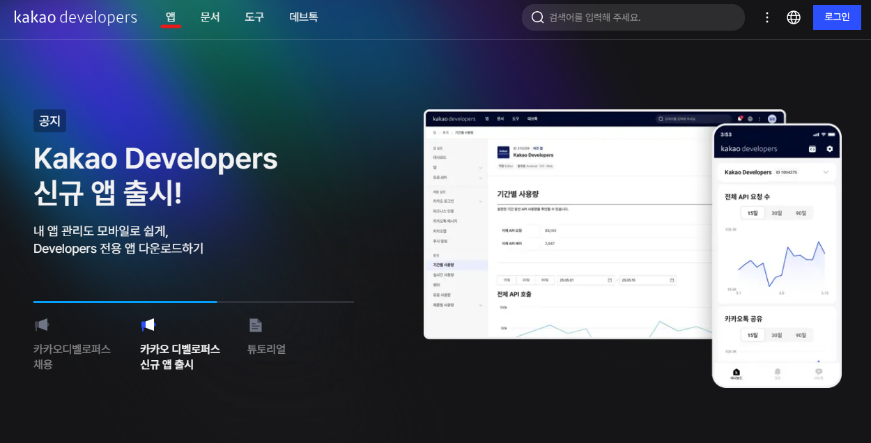 - Kakao Developers 사이트 이용을 위해 카카오 계정 로그인
